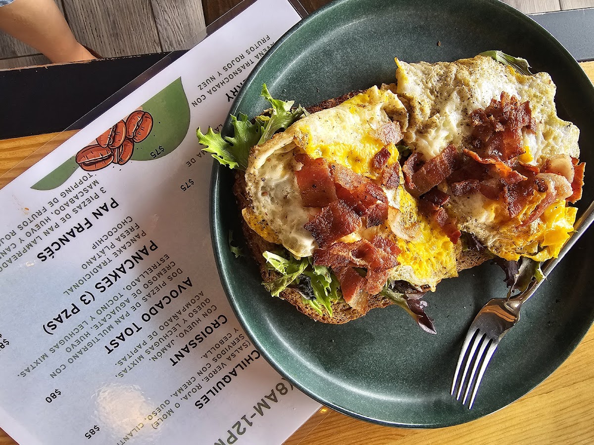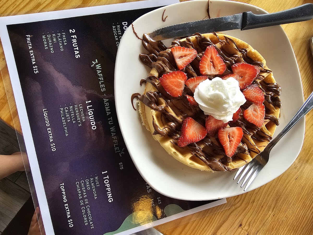 Food items mainly focus on light breakfast and snack options. Key offerings include omelets, various types of waffles (such as Wafle con Fresas), and egg dishes. Additional items feature baked goods like Pan Tornado con Nuevo Aguacate and desserts including Pastel de Zanahoria and Tarta de Frutas.